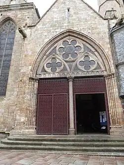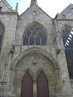 The Porte au Duc, on the southern facade, was originally reserved for castle nobles. It features two round-arched doorways topped by intersecting, molded pointed arches. Flanking the portal are sculpted buttresses and ten windows: eight pointed arches and two round arches to the west, the latter surmounted by a small window with a pediment bearing Guingamp's arms. Two pilasters with scallop-shell capitals and symbolic motifs (crosses, lozenges) frame the portal. A granite parvis from 1960 precedes it. The modern stained-glass windows, damaged by a 1944 American shell that collapsed part of the Central Tower, were restored in 1967 by the Sainte-Marie de Quintin workshop, depicting the Deposition from the Cross and the Last Supper.[8]