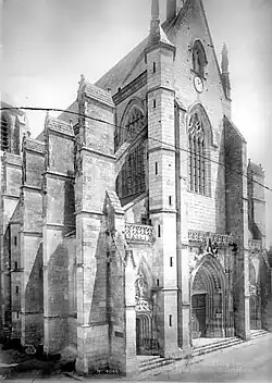 That church was mostly destroyed in 1428 during the Hundred Years' War by English troops under the Earl of Salisbury; only the original square bell tower remains.[7] On 15 August 1443, during a battle against the English, at Dieppe, Louis XI, then dauphin of France, vowed to rebuild a church at Cléry if he was victorious in the battle. Following the French victory, reconstruction began under the direction of architects Pierre Chauvin and Pierre Lepage, but was not yet complete when Louis XI died in 1483.[8]