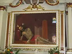 Between the works that were removed are: the paintings of the Holy Family, the Sacred Heart, the Immaculate Heart of Mary, Saint Joseph, Saint John Eudes, Saint Roch, Saint Thérèse of Lisieux, Saint Tarcisius, Our Lady of Mount Carmel, the Infant Jesus of Prague, the Infent Jesus of the Small Flock, the ancient Quiteño painting of the Virgin of Our Lady of Sorrows and the Child Mary. Some remained for a time before being removed, the patron saint Our Lady of Mercy, the titular Saint Aloysius Gonzaga, Our Lady of Perpetual Help, the three pictures of the Ordeal, the Our Lady of Fátima, Saint Augustine of Hippo, Saint Antonio, the embrace of Saint Francis of Assisi, Saint Nicholas of Tolentino, the Fallen Christ, and the divine countenance.[8]