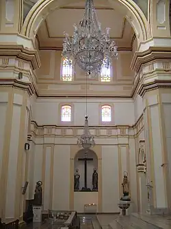 The transept, or transverse nave, projects a bit to the sides though not so much as to form the shape of a Latin cross. It opens in the east–west direction, and has the same width and height of the central nave. The transept comes before the main area of the church, which is highlighted by a marble railing and three tall steps. In addition to this, the area of the transept beside the presbytery there are four other steps, emphasizing the altar area within the church.[4]