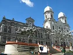 The main façade directly faces Park of Epifanio Mejía. It is totally symmetrical, made up of two domed towers joined by a section that frames the central nave. It has three entrances, the central and two on the sides, each one coinciding with a nave.[4]