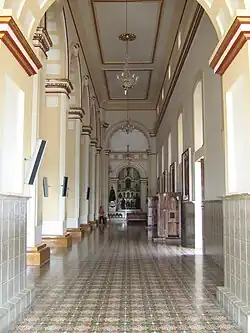 The lateral naves are almost the same length as the central nave. In the external walls they have two series of six windows, each one separated by a decorative cornice. The lower series is of larger and has artistic stained glass.[4] In each side wall there are four paintings of the Stations of the Cross and two wooden confessionals.