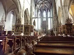 The central nave is lightened by Gothic windows on the south side. The presbytery has the same high as the nave, it is separated from its with profiled stone triumphal arch. The whole central space is vaulted with bays of net vault, placing on pentagonal chaplets decorated with floral ornaments with the coat of arms in the middle of the chaplet.[1]