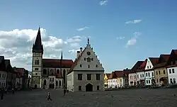 The Church of St Giles is situated on the north side of the Town-Hall Square. It is built in the traditional east - west axis. The presbytery is situated in the eastern part. The central nave is 24 metres high and dominates to the church. There are also two aisles and a presbytery. The 10-metre-high roofs of the presbytery and the nave are separated from each other by a wall, topped by a spire with a cross.[2]