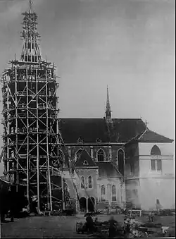 A wooden balcony, topped by a pyramidal roof and a four-meter-high metal cross, is situated on sixth story. The decoration of the south wall includes a stone relief with a city's coat-of-arms. The western facade of the church is reinforced by support pillars and includes Gothic arches and a big rosette window with stone tracery.[3]