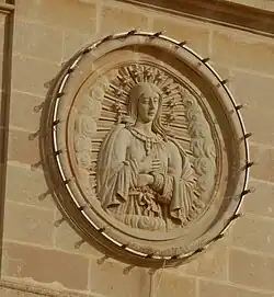The church's façade includes a high plinth, and it is divided into three bays, with the central one projecting outwards. Each bay contains a portal decorated with mouldings and segmented pediments. A roundel with a relief of the Virgin Mary, topped by a triangular pediment, is found above the central doorway. The central bay's upper tier contains another segmented arch, and an aedicule topped by a cross. The edges of each bay are decorated with pilasters having Ionic capitals.[3]