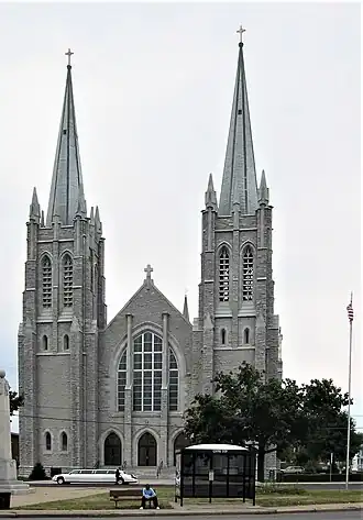The church features a series of fine stained glass windows from Munich, the Henry Keck Stained Glass Studio in Syracuse and from St Louis.[8][9] One stained glass window depicts Polish saint Maximilian Kolbe, who was murdered at Auschwitz.[10] It contains a 1910 Möller organ. That organ is being replaced during the spring of 2018.[11] The original asphalt-shingled roof was replaced in 2009 with slate and copper, in order to ensure longevity.[12]