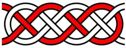 A basket weave knot is made up of two sets of parallel lines drawn inside a rectangle such that the lines meet at the edges of the rectangle. For a true basket weave knot that can be tied with two strands, the number of intersections in each direction cannot have a common divisor. Within this constraint, there is no theoretical upper limit to the size of a basket weave knot.[1] Thus, a knot that has two intersections in one direction can be lengthened with any odd number in the perpendicular direction. If the dimension n in the smaller direction is odd, it is always possible to construct a knot with n + 2 intersections in the other dimension. However, large basket weave knots have a tendency to twist and curl because they are completely flat.[1]
