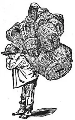 Likewise, no pieces from the 19th century survive, but at that time, the painting of everyday scenes became more popular, including images of homes, which show the survival of indigenous items like petates, along with sombreros and European style baskets.[1] European travelers in Mexico documented what they saw, including the lives of common people, with baskets getting mentioned. One item noted in the records of this time but not before is that of the capote, a kind of rain cape created with layers of palm fronds.[1]