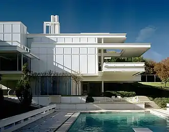 The home is an extravagant white multilevel structure which can be classified as Modern architecture.[3] The single-family home was designed by Paul Rudolph for Sid and Anne Bass in 1966. Sid Bass was a billionaire who made his fortune in the oil business. Sid Bass commissioned the home while he was a young man. The grounds included a swimming pool and a courtyard for vehicles.[2] The entrance is found at the uppermost level of the home. The driveway extends out of the east portion of the home and leads to the entrance.[4] Above the entrance there is the dramatic feature of a horizontal 40 feet (12 m) cantilevered overhang. The architect, Paul Rudolph, thought that the Bass house was the best home he had designed.[2]