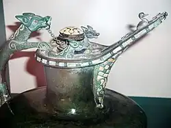 The flagons are richly decorated with glass and coral inlays and a range of animals on the lid. Time has faded the coral but the pieces would have been brightly coloured. The handle is formed as a dog, terminating at the bottom with a human face. The idea of a dog or other animal for a handle comes from Greek and Etruscan culture,[2] as does the motif of two crouching animals lying around the rim, as well as the head at the bottom of the handle. The duck on the spout is a Celtic addition to the scheme. The eyes of the duck and the dogs have been finished by using a complex drill bit[7] and they were drilled by the same person.[8] Both vessels measure just over 40 cm in height. The drinking vessels were found with a pair of Etruscan bronze stamnoi or vessels for wine-mixing that date from the same period (also now in the British Museum).[9]