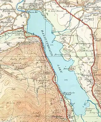 Bassenthwaite Lake is the only body of water in the Lake District to use the word 'lake' in its name, all the others using the local terms 'water' (e.g. Derwentwater), 'mere' (e.g. Windermere) or 'tarn' (e.g. Dock Tarn). Some maps dating from the 18th century do in fact mark this lake with the name Bassenwater, and the use of the name Broadwater for this lake is also attested.