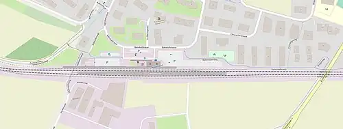 Bassersdorf railway station is located on Bahnhofstrasse, 500 metres (1,600 ft) south of the town center.[3] The station consists of a side platform serving track 1 and an island platform for tracks 2 and 3; only the latter is used in scheduled service. A fourth track is not served by a platform. A small station building lies north of the platforms, along with a bus stop and car park. A pedestrian tunnel connects these facilities with the island platform and with Pöschenstrasse on the south side of the tracks. [7]