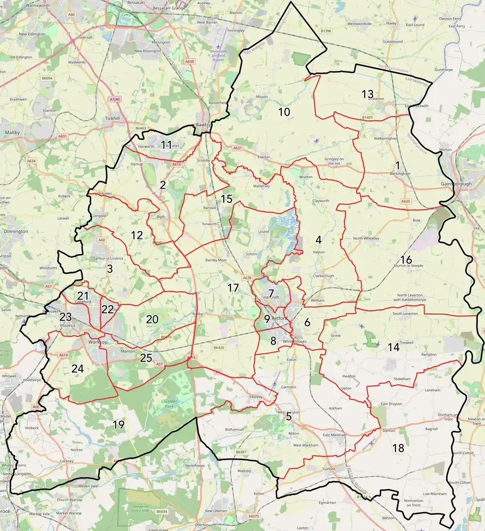 Bassetlaw is divided into 25 wards for electoral purposes. Each ward returns either one, two or three councillors at each election depending upon the number of electors within each ward.[33]