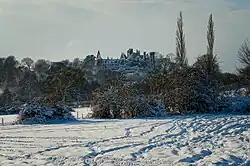 For a time in 1578, Christine Hogg and her eldest daughter left Mary's household, and Walsingham prevented her return.[45] By August 1587, Bastian and Christine had two daughters, Mary and Elizabeth, sons David and Jacques, and five younger children whose names were not recorded. David, the eldest son, left the Queen's household, which was called her family, in May 1571. One child was born at Wingfield Manor in November 1569 at the time of the Northern rebellion. Later, the Earl of Shrewsbury wrote that Mary Queen of Scots had planned to escape after the birth, dressed as Christine's midwife.[46] The midwife's part would have been played by Anne Somerset, Countess of Northumberland because they were "something like in personage".[47][48] The Northumberlands were staying at nearby Wentworth House.[49] The Countess of Northumberland rode north to join the rebellion. On 17 November 1569 she was at Brockenborough near Boroughbridge. The Elizabethan writer William Camden attributed an escape plan from Wingfield at this time to Leonard Dacre.[50] Other, simpler, escape plans involved Mary exiting from a window with a couple of servants.[51]
