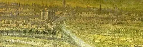 During the 16th century the area around the Bastille developed further. Early modern Paris continued to grow, and by the end of the century it had around 250,000 inhabitants and was one of the most populous cities in Europe, though still largely contained within its old city walls – open countryside remained beyond the Bastille.[32] The Arsenal, a large military-industrial complex tasked with the production of cannons and other weapons for the royal armies, was established to the south of the Bastille by Francis I, and substantially expanded under Charles IX.[33] An arms depot was later built above the Porte Saint-Antoine, all making the Bastille part of a major military centre.[34]