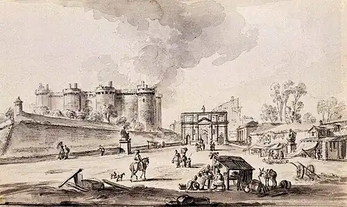 The area around the Bastille was transformed in the reign of Louis XIV. Paris' growing population reached 400,000 during the period, causing the city to spill out past the Bastille and the old city into the arable farmland beyond, forming more thinly populated faubourgs, or suburbs.[62] Influenced by the events of the Fronde, Louis XIV rebuilt the area around the Bastille, erecting a new archway at the Porte Saint-Antoine in 1660, and then ten years later pulling down the city walls and their supporting fortifications to replace them with an avenue of trees, later called Louis XIV's boulevard, which passed around the Bastille.[63] The Bastille's bastion survived the redevelopment, becoming a garden for the use of the prisoners.[64]