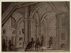 Structurally, the late-18th century Bastille was not greatly changed from its 14th-century predecessor.[89] The eight stone towers had gradually acquired individual names: running from the north-east side of the external gate, these were La Chapelle, Trésor, Comté, Bazinière, Bertaudière, Liberté, Puits and Coin.[90] La Chapelle contained the Bastille's chapel, decorated with a painting of Saint Peter in chains.[91] Trésor took its name from the reign of Henry IV, when it had contained the royal treasury.[92] The origins of the name of Comté tower are unclear; one theory is that the name refers to the County of Paris.[93] Bazinière was named after Bertrand de La Bazinière, a royal treasurer who was imprisoned there in 1663.[92] Bertaudière was named after a medieval mason who died building the structure in the 14th century.[94] Liberté tower took its name either from a protest in 1380, when Parisians shouted the phrase outside the castle, or because it was used to house prisoners who had more freedom to walk around the castle than the typical prisoner.[95] Puits tower contained the castle well, while Coin formed the corner of the Rue Saint-Antoine.[94]
