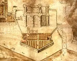 A depiction of the Bastille and neighbouring Paris in 1575, showing the new bastions, the new Porte Saint-Antoine, the Arsenal complex and the open countryside beyond the city defences