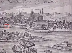 In the late 16th century, during the Wars of Religion, Henry III sought refuge in Tours, prompting Jean VI d'Aumont to propose a new defensive wall.[C 2] By this time, Tours had expanded beyond its 14th-century wall, particularly westward, as depicted in a 1572 bird's-eye view. A new enclosure was planned to protect the city from the ruau Sainte-Anne in the west to Saint-Pierre-des-Corps in the east. Jacques Androuet du Cerceau designed the final plan after an earlier proposal[C 3] by Gilles de Courtenvaux de Souvré, governor of Touraine,[2] was deemed inadequate; the eastern bastion was named after Souvré.[3] The plan was authorized by Henry IV through letters patent in April 1591.[G 1][D 1]