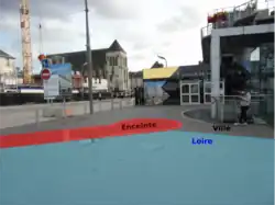 An excavation in 1991 at Place du Général-Leclerc revealed that the retaining wall of a bastion defending the Saint-Étienne gate is supported by piles driven into the ground or a platform of beams. The wall, constructed with two faces of medium-sized yellow tuffeau stone blocks from Saint-Avertin, has a rubble masonry core of tuffeau blocks, with a total thickness of 2.4 meters at ground level. The outer face features a pronounced batter.[12] Since construction, the ground level has risen by approximately 4 meters.[13]
