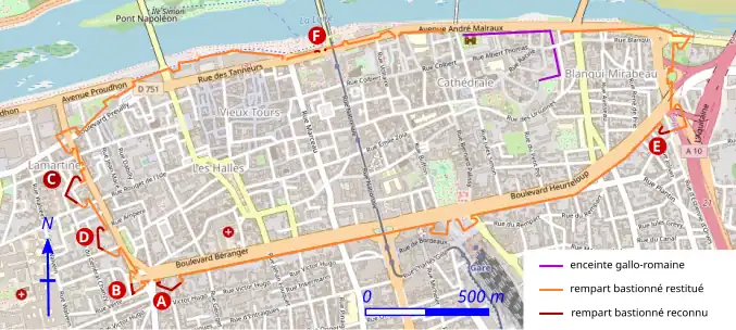 In the western part of rue Victor-Hugo, near the Saint-Éloi priory, at the end of an alley opening onto the northern side of the street (47.388198, 0.677872) (A),[N 6] a molding that once adorned the upper section of the curtain wall of the Saint-Joseph bastion remains visible for several meters. Behind the Saint-Éloi priory, at the corner of rue Verte and rue Élise-Dreux (47.38772, 0.675353) (B), the tip of the southwest bastion (Saint-Éloi bastion) of the rampart is still identifiable; the bastion wall continues along rue Élise-Dreux. On rue des Oiseaux (47.391323, 0.67186) (C), as well as on rue Ledru-Rollin and impasse Adrien-Deslondains (47.389921, 0.673465) (D), the cadastral irregularities and the layout of the buildings reflect the shape of two former bastions on the western side, namely the Bastion des Oiseaux and the Bastion de la Santé; the northern orillon of the Bastion des Oiseaux remains visible on the Napoleonic cadastral map. At the opposite end of the city, on boulevard Heurteloup (47.393884, 0.704135) (E), a building courtyard is enclosed by a row of garages that recreate the shape of the orillon of the Bastion de Souvré. The remains of the bastion that flanked the eastern side of the Saint-Étienne gate, near the train station, were uncovered and studied during the excavation for the underground parking lot beneath Place du Général-Leclerc; they were later destroyed.[G 5] Remains of the western bastion of the same gate had already been found during the construction of the Tours tourist office in 1965.[37] To the north, the trace of the rampart on either side of the rue Ragueneau landing stage (47.396554, 0.686068) (F) is reproduced in the paving of the modern ground surface.