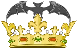 The heraldic use of the bat has its origins in the "royal dragon" crest (cimera reial) of the coat of arms of the Kings of Aragon. The royal helmet has a víbria, a traditional Catalan dragon, emerging from a crown as its crest. Although traditionally the dragon helmet is ascribed to king James I of Aragon (1208 – 1276),[1] the winged dragon did not appear over the helmet until Peter IV of Aragon's reign (1319 – 1387). This crest was then transformed into a bat by municipalities.[2]