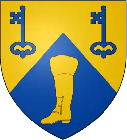The arms of the Beta Shoe Museum Foundation were formally registered with the Public Register of Arms, Flags and Badges of Canada on 6 May 1995.[38] The coat of arms uses the official colours of the institution, blue and gold, and features a triangular division placed along the position of the thongs found on most sandals.[38] The boot featured on the arms represents all footwear, whereas the two keys is a common symbol in Canadian heraldry for museums.[38] The crest of the arms is animal skin, defaced with a knife, representing two materials used for shoe-making.[38]