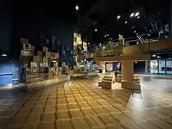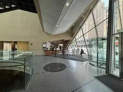 The museum building contains four exhibition galleries, used to exhibit the permanent, and temporary and travelling exhibitions.[6] The museum presently operates only one permanent exhibition, All About Shoes: Footwear Through the Ages, with the other three galleries used to house temporary exhibitions.[6][21] The museum's permanent exhibition is situated in the lower two levels in the building's east side, whereas specialized temporary exhibitions are situated in the galleries of the building's second and third levels.[20][22] The exhibition galleries were designed as "neutral spaces," enabling the museum to host a variety of exhibitions.[23] In order to accommodate the exhibits of delicate and fragile objects, the museum's galleries were all designed with strict environmental controls, with little natural light entering the galleries.[23]