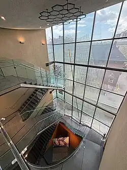 The interior of the structure is organized into three sections moving east to west, and spread across five floors. In addition to exhibit halls, the building also includes a gift shop, lecture theatre, and reception hall.[13][18] The floors in the museum's lower levels are made of dark-coloured woods, shaped in diamond parquets, a trompe-l'œil that draws visitors' eyes to their own feet.[19] The building's main hall features a central stairwell ornate with bronze medallions cast by Dora de Pedery-Hunt; and circles cut into the stair risers to let in light from the windows above.[20] The stairway spans five floors in total, including two below ground.[18] A 12.8-metre-high (42 ft) stained glass panel is next to the building's central staircase.[13][18] The building's leather-clad reception desk is also designed to appear as a shoe from the stairway.[20]