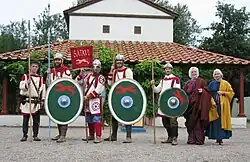 The members of the German Bodyguard were recruited from the West Germanic-speaking tribes resident in, or on the borders of, the Roman province of Germania Inferior, with most recruits drawn from the Batavi[12] but also from neighbouring tribes of the Rhine delta region, including the Frisii,[13] Baetasii[14] and Ubii.[15][16] Little is known about their organisation; from inscriptions it is known that there existed, as in all Roman cavalry units, the officer rank of decurion. The exact size of the unit, which was at least partially mounted, is also unknown, but is described in ancient sources as a cohort, which in this period normally implied a strength of ca. 500 men, or less precisely as a numerus, whose size could vary. Under the Emperor Caligula, the Bodyguard may have consisted of 500 to 1,000 men.