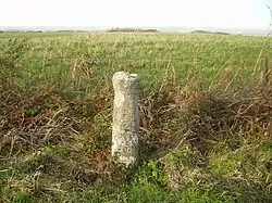 Above the village rises Batcombe Down and, further east, Gore Hill, near the top of which is a small stone pillar known as the Cross-in-Hand (or Cross and Hand).[5][6] The pillar, a Grade II listed structure and a Scheduled Ancient Monument,[7] is a little over 1 metre (3.3 ft) in height and may date from before the Norman Conquest, as do other shafts such as the Pillar of Eliseg.[8] At one time there may have been a hand carved on one face, but nothing is visible today,[8] though the pillar has acquired stories about images of a ghostly hand being seen grasping a bowl at its top.[9] Thomas Hardy used the pillar in his novel Tess of the D'Urbervilles, in a scene in which Alec d'Urberville instructs Tess to "put your hand upon that stone hand, and swear that you will never tempt me—by your charms or ways."[5] The pillar also features in Hardy's poem "The Lost Pyx".[5]