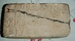 Bath bricks were made by a number of companies in the town of Bridgwater, England, from fine clay dredged from the River Parrett near Dunball.[2] The silt, which was collected from the river on either side of the Town Bridge, contained fine particles of alumina and silica.[3] It was collected from beds of brick rubble left in the rain for the salt to be washed out and then put into a "pugging mill" which was powered by a horse to be mixed, before being shaped into moulds and dried. These would be wrapped in paper and boxed for sale in England and throughout the British Empire.[4] By the end of the 19th century around 24 million bath bricks had been produced in Bridgwater for the home and international markets.[5]