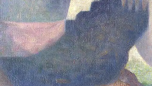 One of the recurrent themes of these painstakingly detailed new theories was the idea that humans may not perceive colours in isolation but rather, that one colour may be seen to interfere with another colour neighbouring it. In this way, colour perception was explained as a complex, interpretive process, rather than a static and simple record of visual data. Seurat’s response to the theories in these writings is widely evident in the Bathers, most obviously in such areas as those of the torso and legs of the man seated centre-left on the persimmon-orange cushion, and of the central figure as his back contrasts with light blue water and his arm contrasts with water of a darker hue.