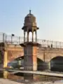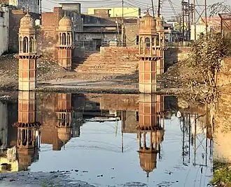 The towers are made from stone brick and each have eight sides, with red sandstone panels set in frames of white stone.[3] Two panels display the names of those who made financial contributions to the building of the ghat; listed in order of amount donated.[2] Opposite the ghat, further steps were built.[2] The river serves as a boundary to the east of Bulandshahr, and the bridge receives the main roads entering the town, resulting in the towers forming a landmark site for approaching visitors.[3] Each tower is topped with eaves and brackets over a plinth that provides support to a dome-topped open kiosk.[3] The height of each tower is 52 ft (16 m); two are on land and two are at the edge of the water.[3]