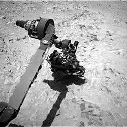![]() Images taken by the Curiosity rover (September 30, 2012). (Above) Context view area 16 cm (6.3 in) x 12 cm (4.7 in);[1] (Below) Close-Up view area 3.3 cm (1.3 in) x 2.5 cm (0.98 in).[2] | |