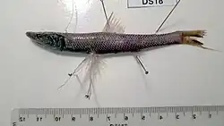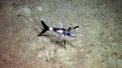 Bathypterois is a genus of deepsea tripod fishes. They are a diverse genus that belong to the greater family Ipnopidae and order Aulopiformes. They are distinguished by having two elongated pelvic fins and an elongated caudal fin, which allow them to move and stand on the ocean floor, much like a tripod, hence the common name.[2] Bathypterois are distributed worldwide with some particular species of the genus having specialized environmental niches, such as lower dissolved oxygen concentrations.[3] Bathypterois have a reduced eye size, highly specified extended fins, and a mouth adapted to filter feeding.[2] They are filter feeders whose main food source is benthopelagic planktonic calanoid copepods, but some variation is seen with maturity in secondary food sources.[4] Bathypterois use their three elongated fins for a wide range of motion from landing to standing on the ocean floor to catching prey, for which these fins serve as specialized perceptory organs.[2] Bathypterois have both male and female gonads at once making them simultaneous hermaphrodites, whose gonads go through five stages of development following seasonal autumn spawning.[5]