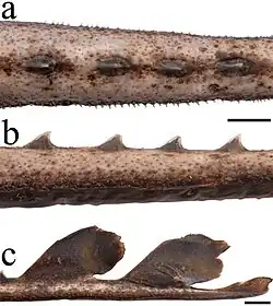 The tail has 18 laterally compressed spines, the dorsal surface is covered in denticles, while the ventral surface lacks denticles.[1][2]