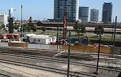 The hill had many other uses. In February 1839, it acted as a grandstand for Melbourne's first horse race, with the site later the site of navigation beacons, and a hospital.[5] At around the same time, Batman's Hill was also the site of the first cricket match played in Victoria by the founders of the Melbourne Cricket Club.[6] The western slope of Batman's Hill was sold to the government in 1847 and a powder magazine was built. At the foot of the slopes were tanning pits and melting works.