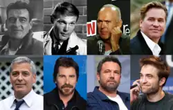 Batman actors since 1943. Top to bottom, left to right: Lewis Wilson, Adam West, Michael Keaton, Val Kilmer, George Clooney, Christian Bale, Ben Affleck, Robert Pattinson.