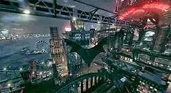 During early development, Rocksteady placed a prototype Batmobile in the existing Arkham City map, and learned that the claustrophobic city designed for Batman to glide and grapple did not work well for driving a vehicle.[27] Gotham City was thus redesigned with wider streets to allow space for the Batmobile and other street traffic to drive without colliding into walls, and buildings were made taller to accommodate the vehicle's ejection ability.[27][66] To redesign Gotham City, the designers attempted to build on the previous games' gothic architecture while making a more believable and dense city. Alongside minor elements like neon lights, billboard advertising, and American-style cars, the team developed ideas for shops that could be found in the city, while retaining a grimy, dystopian theme. Describing the design, Hego said: "every kind of element we've added in there ... makes the entire experience feel a little out of time. You couldn't pinpoint whether it's twenty years ago, now or in ten years time."[86] The designers valued making an open world that was "rich, vibrant, dense...and full of interesting things to do" over it just being large.[87]