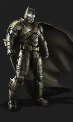 Michael Wilkinson designed the costumes for Batman in Batman v Superman: Dawn of Justice (2016).[44][45] It is influenced by the Batsuit seen in The Dark Knight Returns,[46] and is noted by Bruce and Alfred to include additional armor to compensate for Bruce's greater age, as well as a device in the cowl to alter Bruce's voice when in the suit, both to make his voice impossible to identify as well as add an extra level of intimidation. The Batsuit is made of a Kevlar-titanium weave, is highly durable, making it resistant to knives and low-caliber firearms, the cowl and neck area of the suit consists of fabric-coated titanium alloy plating, protecting his neck and head from blade injuries and small-caliber firearms (a man using a knife could only cause sparks to fly when trying to stab Batman in the back of the neck). Not even bullets can pierce the suit at point-blank range, but some areas are somewhat vulnerable as a thug is successfully able to stab Batman with a knife in the upper arm. The cape also provided for gliding capabilities, although Batman rarely uses this, relying on the Grapple Gun instead.[46] Unlike the Batsuits in the Tim Burton, Joel Schumacher and Christopher Nolan films this suit is black and grey as opposed to all-black or all-blue. An early scene in the film depicts Alfred conducting maintenance on a high-tech helmet with the leather mask laying next to it, implying that the Batsuit is worn overtop of armor. Multiple variants of the chest insignia were created, with the final design chosen because of the manner in which it emphasized Affleck's pectoral muscles.[47]