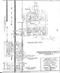 Landings from sea or air landing assault were protected by coastal defences and by infantry and a panzer tank unit located inland. Close to the battery were two 8.1 cm and three 5 cm mortar positions, three 7.5cm FK 231(f) field artillery guns, 16 concrete machine gun positions, barbed wire and mines which gave all round protection.[14]