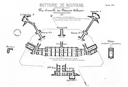 The Batterie de Bouviers was part of an ensemble comprising two forts, the Fort de Villeras in Saclay and the Fort du Haut-Buc, with five peripheral works: the Batterie de la Port du Désert (destroyed), the Batterie de la station de St-Cyr (partly destroyed), the Batterie du Ravin de Bouviers, the Ouvrage des Docks and the Batteries de Bouviers.[1]