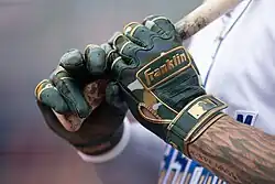 In 1932, The Sporting News reported that Lefty O'Doul and Johnny Frederick of the Brooklyn Dodgers both wore batting gloves to protect injured hands, with O'Doul wearing an ordinary street glove and Frederick supplementing his with bandages and padding.[5] The same year, Detroit Tigers rookie catcher Hughie Wise advocated wearing golf gloves while batting to improve grip and protect from bruising, but doubted they would ever become widespread. "Baseball is a conservative sport and if a fellow went to bat wearing gloves someone would call him a Bolshevik or a sissy," he told the Detroit Free Press.[7]