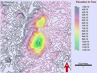 The volcano is composed of alkali feldspar granitic rock of the Robertson River Igneous Suite. This includes felsic complex material such as biotite, hornblende-biotite, magnetite, and alkali granitic rock including rhyolite on the eastern slopes of Battle Mountain[5] and the adjacent (and geologically related) Little Battle Mountain (elevation 937 feet).