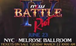 Battle Riot is a recurring event that was established by MLW in 2018. The event is named after the Battle Riot match, a multi-competitor match type in which wrestlers are eliminated until one is left and declared winner. The match begins with a number of participants in the ring, who are then eliminated by either pin, submission, or going over the top rope and having both feet touch the venue floor. The declared winner of the Battle Riot match receives a future title shot for the MLW World Heavyweight Championship. On March 19, 2022, it was announced that Battle Riot IV would take place on June 23, 2022 at the Melrose Ballroom in New York City.[3][4]