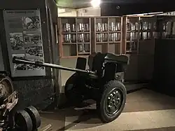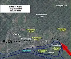 Upon his arrival, Brig. Gen. Smyth set up his headquarters in front of the Kvam Church.[10] The British soldiers of 1st KOYLI arrived around 4:15 a.m. They quickly shed their heavy arctic clothing and, carrying only their weapons, ammunition and '37 web gear, began to set up defensive positions. Lt. Col. Cass put "A" and "C" companies on the island in the Lågen river west of the road and "B" company east of the road up on the steep slopes.[15] The British soldiers were armed with rifles and bayonets, Bren light machine guns, and two Ordnance ML 3 inch mortars.[16] In addition to their light weapons, the British soldiers had five 25 mm Hotchkiss anti-tank guns set up at the forefront, and three in support further behind.[17]