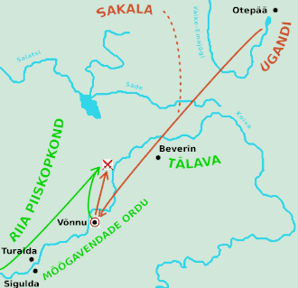 The Crusaders decided to cross the Jumara after having believed that the Estonians were fleeing in haste, however were either attacked, or were demanded to surrender by the Estonians after having been surrounded and encircled.[3] The Brothers of the Sword attempted to break free from the encirclement by force,[4] fighting their way out of the encirclement, the Christian Latgalians and Livonians followed suit, however around one-hundred of them were captured by the Estonians.[4]
