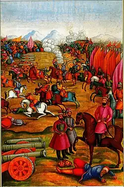 The Persian Jazāyerchi, after two hours of continuous musketry directly charged into the janissaries ranks. With impeccable timing Nader now released two contingents of cavalry, each 15,000 strong with Haji Beg in command of the right and himself in command of the left contingent, he manoeuvred around the Ottoman line and caught it in a double-envelopment.[8]
